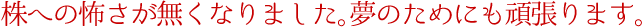 月の収支が黒字。夢に向かって頑張ります!今回もメールでの解説をありがとうございました。メールや動画で学んでいくうちに株に対する怖いイメージが無くなって、いろいろと勉強になってきて います。教えに忠実に従って早速実践していますが、先生には感謝しています。実は、私も窪田さんと同じく、世界の恵まれない地域の子どもたちの為に学校を つくる事が夢でした。そのためにも頑張ります。